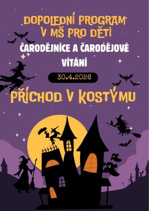 Dne 30.4.2026 nás čeká čarodějnický rej. Děti se mohou těšit na dopoledne plné soutěží a kouzelných čarodějnických úkolů.